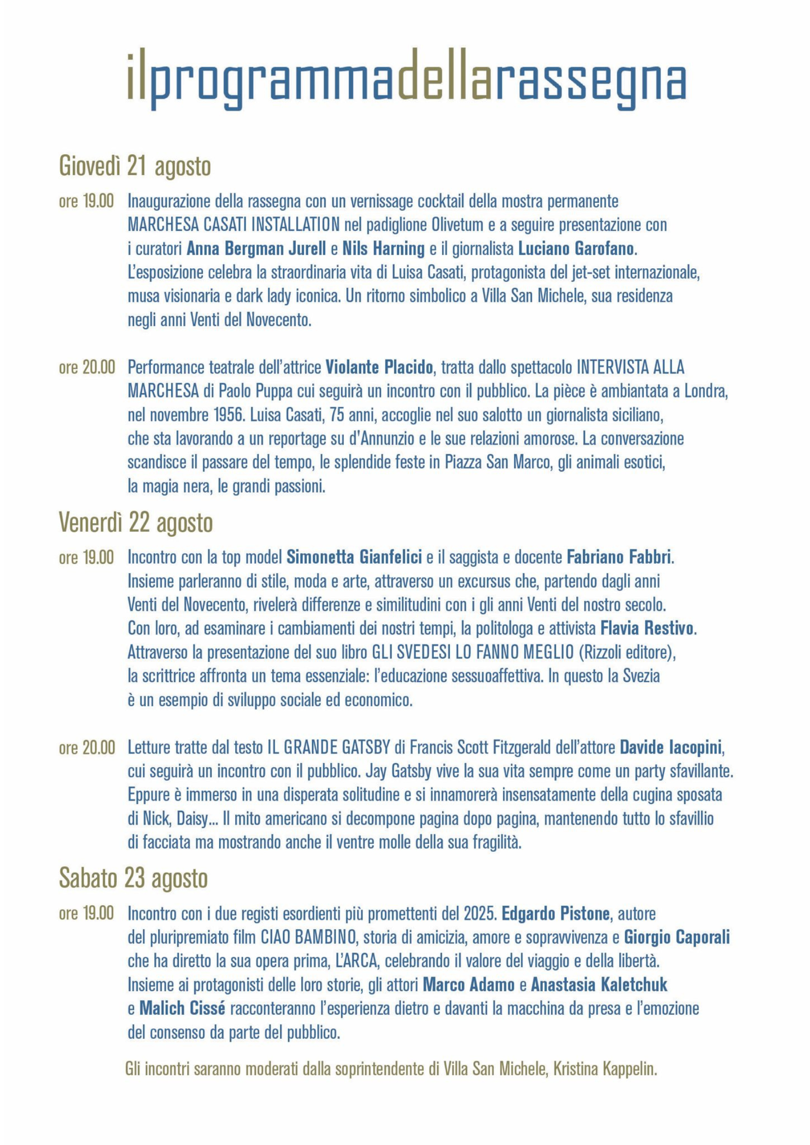 All events will be moderated by Villa San Michele’s director, Kristina Kappelin.