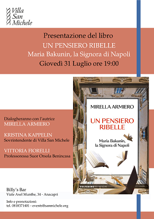 Villa San Michele is pleased to host the presentation of Mirella Armiero’s latest book, “Un pensiero ribelle. Maria Bakunin, la Signora di Napoli” (Solferino). Joining the author in conversation are historian Vittoria Fiorelli (Suor Orsola Benincasa University) and Kristina Kappelin, Director of Villa San Michele.The book explores the remarkable life of Maria Bakunin, the first woman in Italy to graduate in chemistry (1895). Through passion and determination, she made lasting contributions to science and society in Southern Italy during a vibrant era of cultural and intellectual growth.